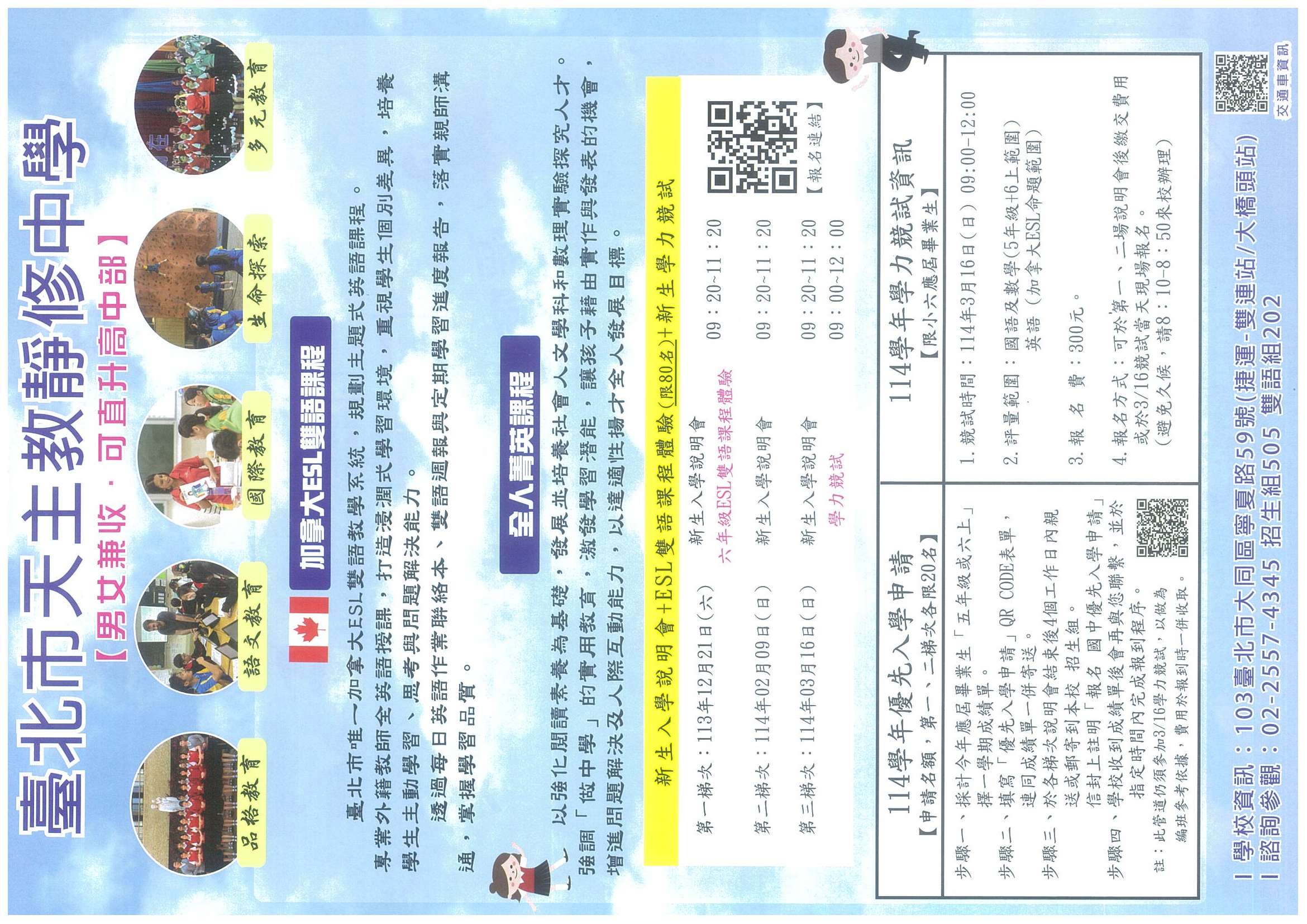 一、為使 貴校家長與學生充分了解本校國中部加拿大雙語課程、全人菁英課程之入學資訊,舉辦招生說明會,如下列,鼓勵對課程有興趣之 親師生參加。