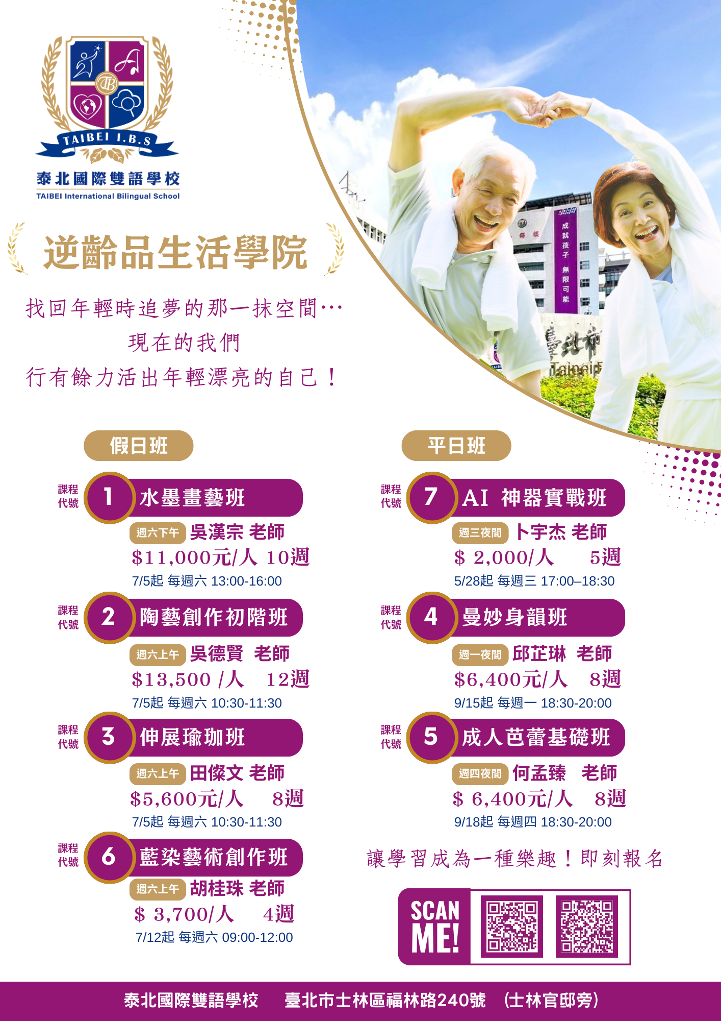 一、本校為提升學生假期學習效益與成人週末充實生活,特規劃多元營隊與終身學習課程,結合國際教育、科技應用、藝術素養與身心療癒等主題融入課程。