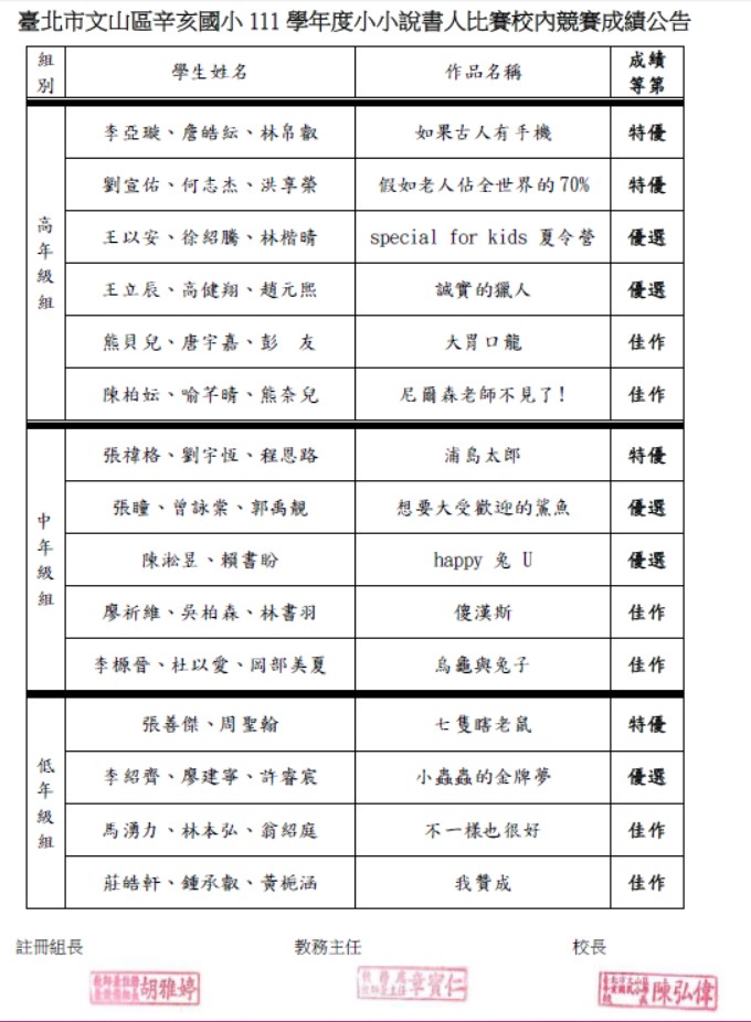 恭喜以下獲獎同學,也肯定所有報名參加的小小說書人們,你們的表現都很出色,值得大聲喝采。